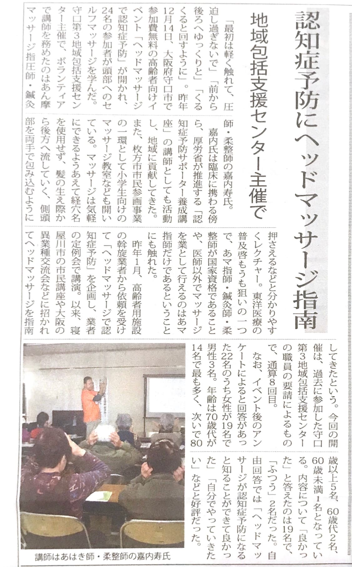 ④市民活動に参加するなど、地域貢献にも非常に熱心です。公益社団法人枚方鍼灸マッサージ師協会の副会長として枚方市民の健康啓発活動に従事し、地域貢献活動を行っている。 留守家庭児童会室市民参画事業として枚方市下の小学校に 様々な講師活動を行うなどしている。 枚方市での活動 NPOフェスティバル参画、枚方医療福祉フェスティバル参画 枚方市新春走ろう会(ランナーサポート担当) 枚方市保健所での健康講座、認知症サポーター養成講座 京都信用金庫にて健康講座 | ![]() ![]() |