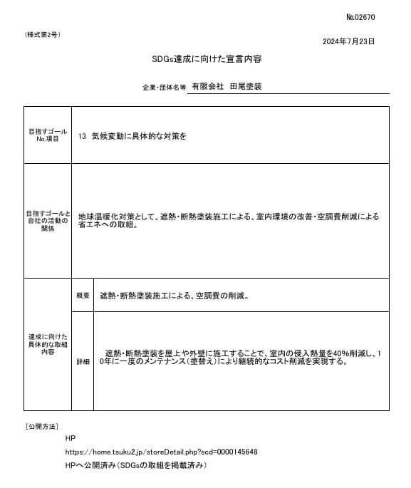 有限会社 田尾塗装は、SDGs宣言事業者として、