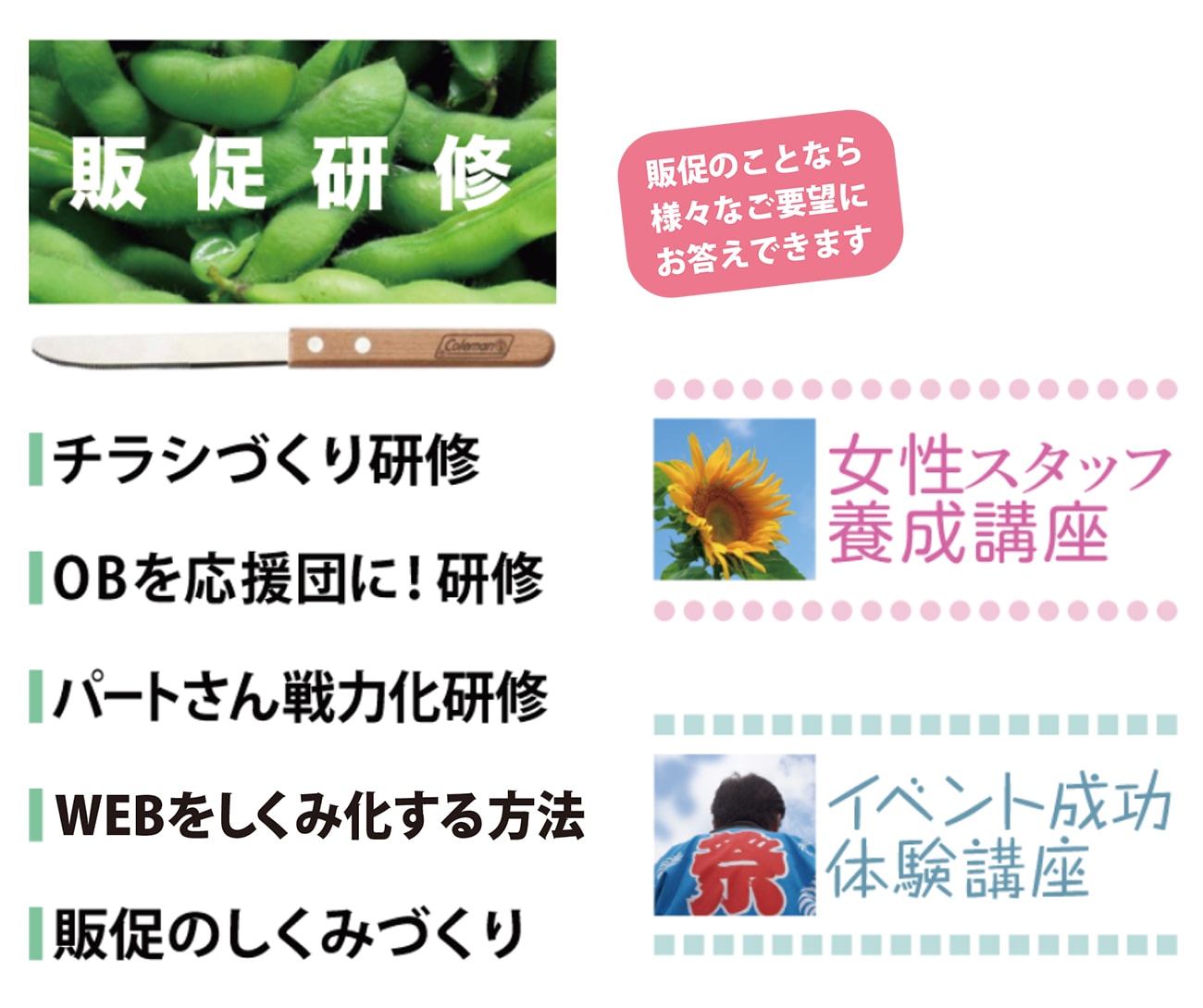 マーケティングや販売促進の内容であれば、リクエストにお答えする研修メニューを作成し、対応させていただきます。