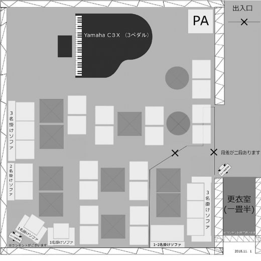 楽器演奏可能!グランドピアノ、ドラムセット、ギター・ベースアンプ常設♪自主公演、公開レッスン、懇親会、忘新年会、ライブ公演、ファンミーティングなどにも最適!!