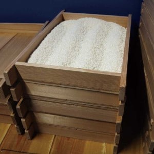 ー麹(こうじ)ー 米麹を木製の容器に小分けする 蓋麹法(ふたこうじほう)で全量手造りしています |