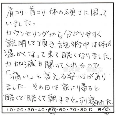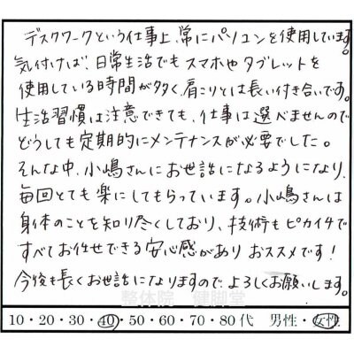 ・肩が辛い方は【足つぼ20分】+【整体40分】で肩を重点的に施術。