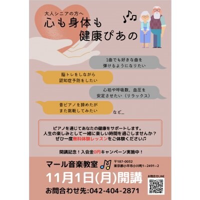 認知症予防や趣味としてピアノを習われる方が多いです。