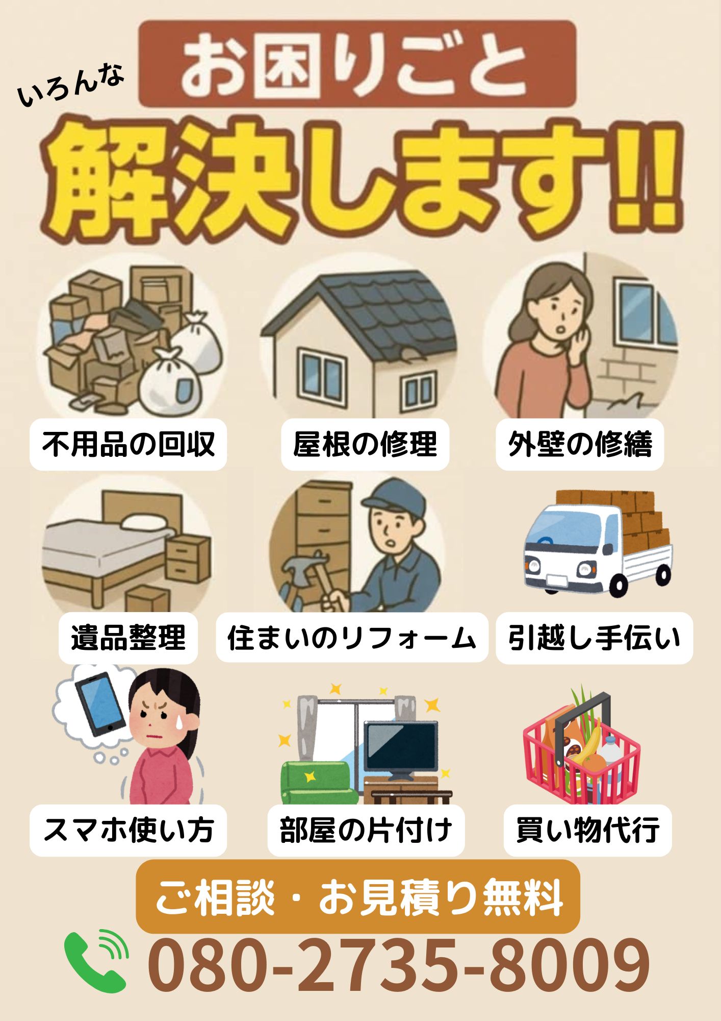※その他のエリアでもご対応できる場合もありますので先ずはお電話にてお問い合わせください。080-2735-8009