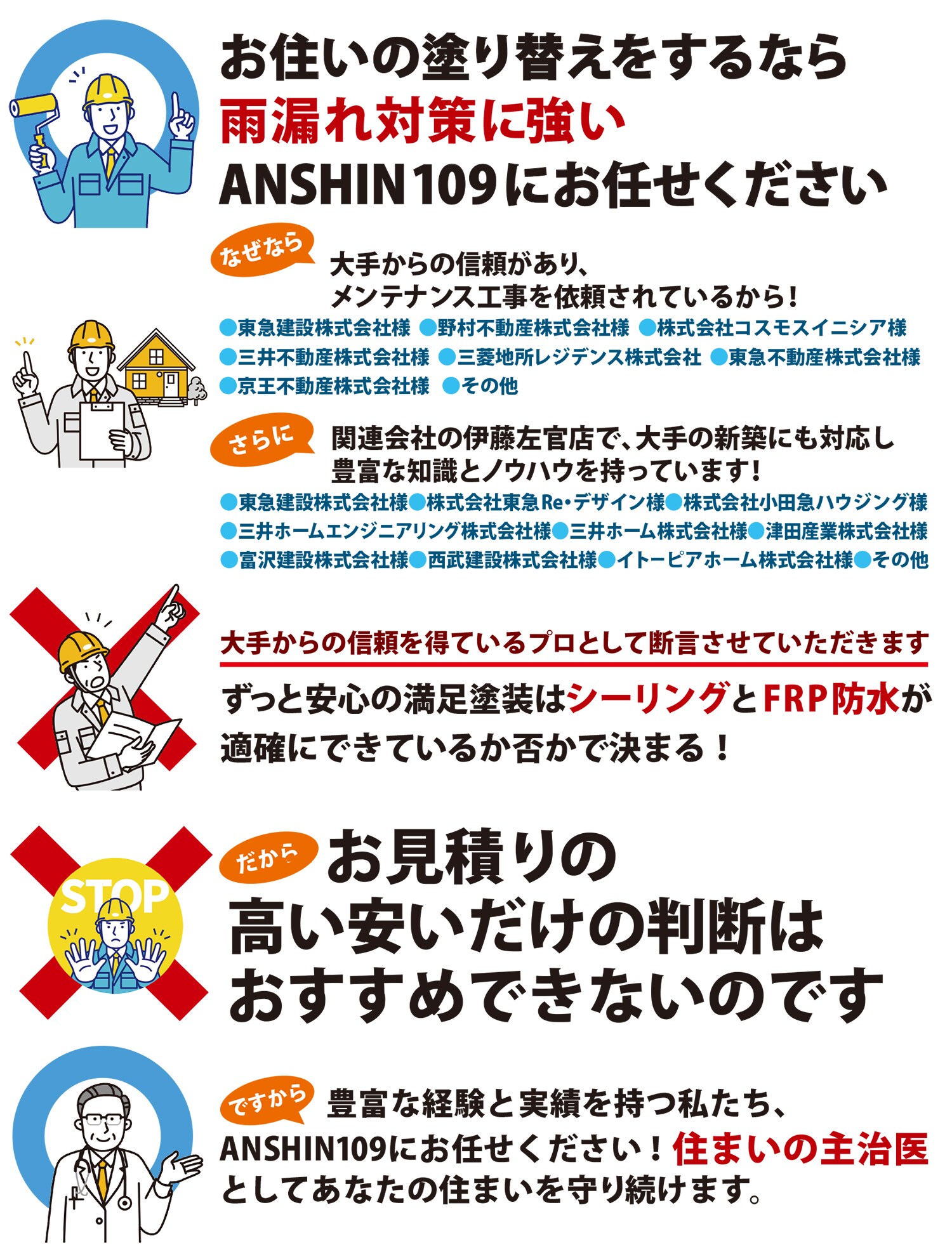 防水工事は専門業者の数が非常に少なく、専門性の高い分野です。誤った施工は症状をさらに悪化させたり、雨漏りが発生しご自宅の寿命を縮めてしまいます。ですから、本当に住まいを長持ちさせ、住み慣れた我が家でず〜っ安心して暮らしたいなら、住まいの主治医であるANSINにお任せください。