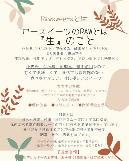 小麦粉、乳製品、卵、白砂糖は一切使いません。そして、オーブンでは焼かない、揚げない、火を使わないスイーツです。7代栄養素全て入っているお食事になるスイーツを一度、お試しくださいませ。果物を練り込んでつくるロースイーツは当店の特徴です。