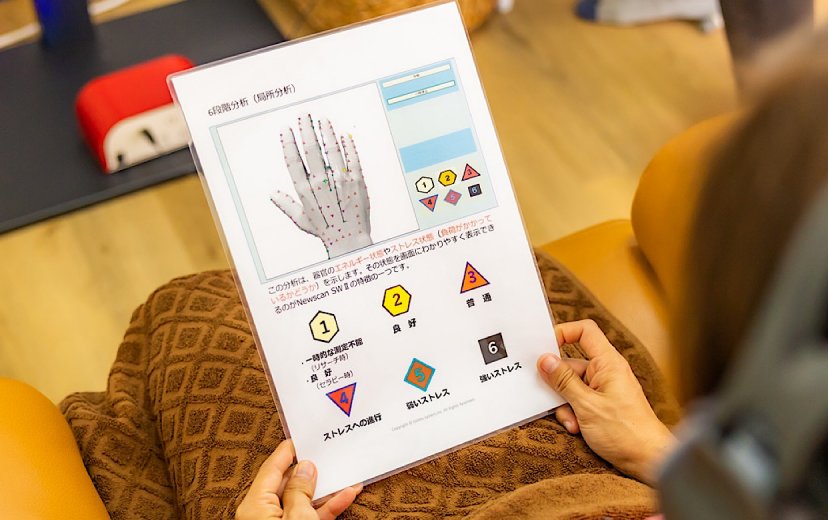 当店で使用するNewscanSWⅢ®(ニュースキャンSWⅢ®)は超低周波音(1Hz〜9Hz)により、全身の健康度を衣服着用のまま、ヘッドフォンを装着するだけで、 カラダの健康状態を簡単にしかも短時間で総合的にチェックし、様々な情報を可視化して自分の体の状態を教えてくれます。