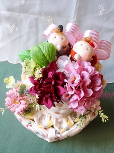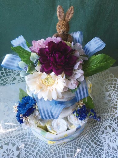 紙オムツで土台を作成し、スタイやお肌に優しい肌着、お花(造花)などで可愛らしくアレンジさせて頂きます。