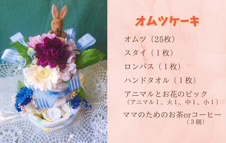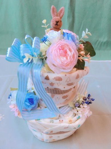ご出産祝いに人気のオムツケーキをお子様の健やかな成長を祈りながらひとつひとつ心を込めて作っています。