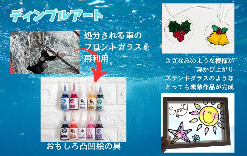まだまだご存じの方が少ないですが、処分される車のフロントガラスを再利用できるように加工された「おもしろ凸凹絵の具」を使って描いていきます。さざなみのような模様が浮かび上がり、ステンドグラスのようなとっても素敵作品が完成します。