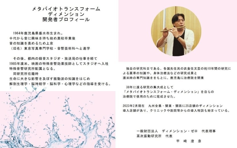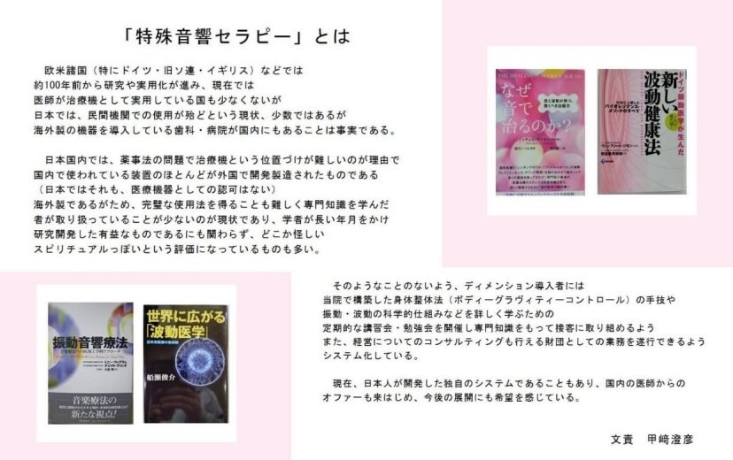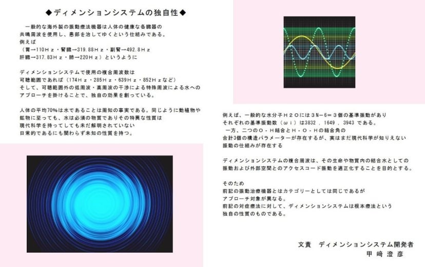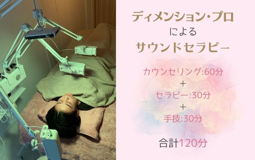 ディメンションサウンドシステムは、体内の水の振動を高め波動をととのえるこで、心身を本来の状態に戻すことを目的としたサウンドセラピーです。