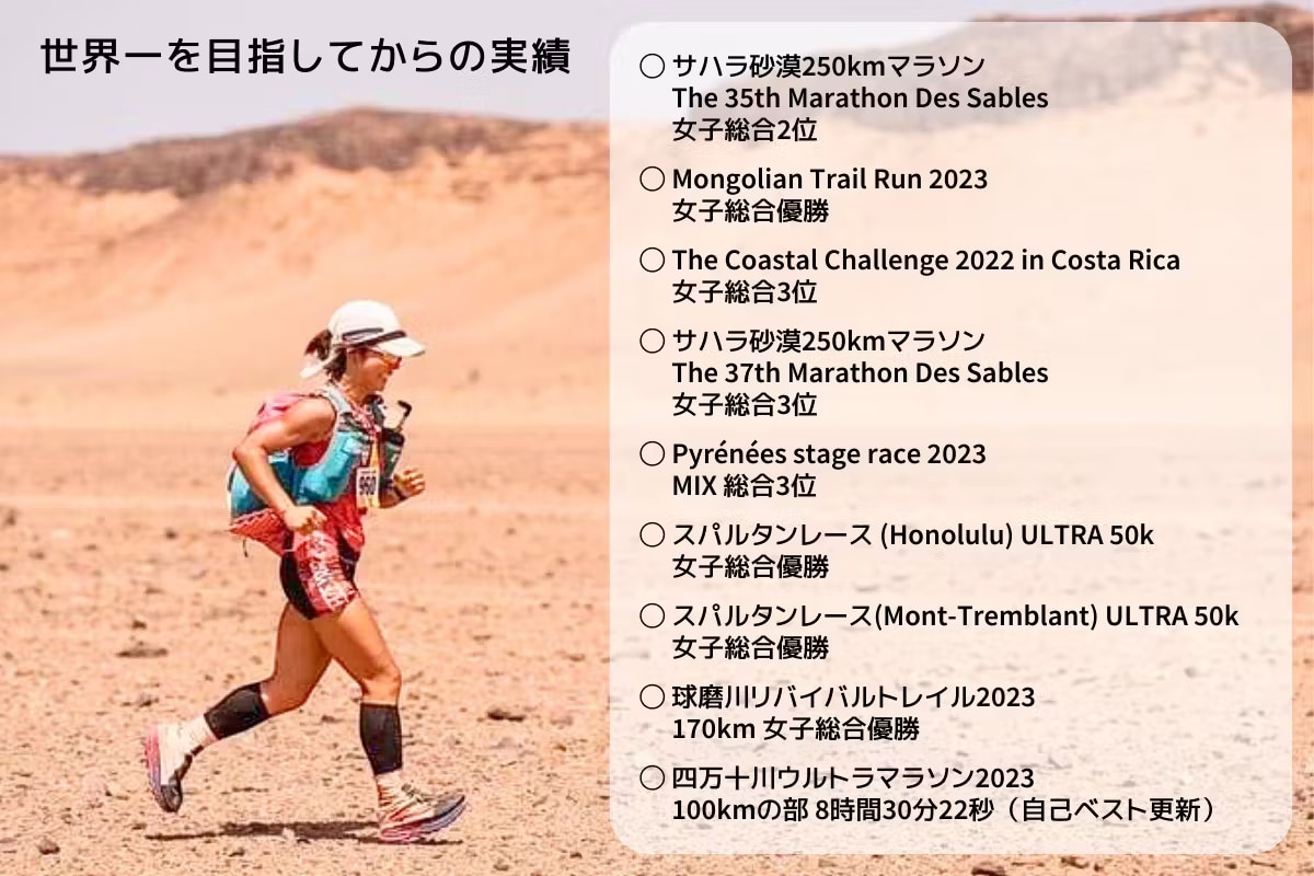 2025年サハラマラソンで女子総合優勝を目指して、海外のさまざまなレースで経験を積みつつ、日々精進しております。ぜひ応援よろしくお願いします!
