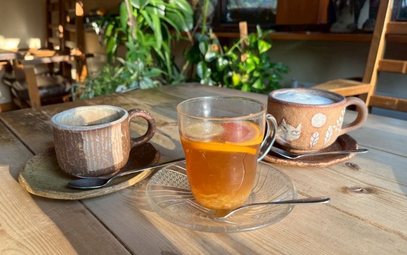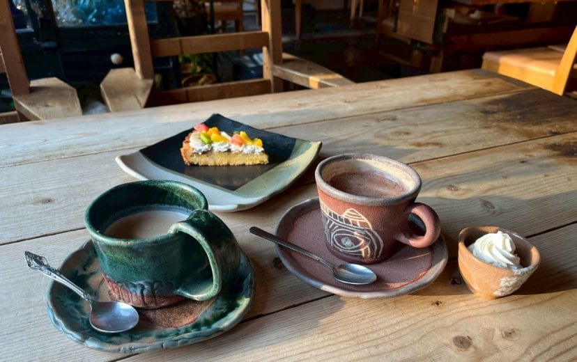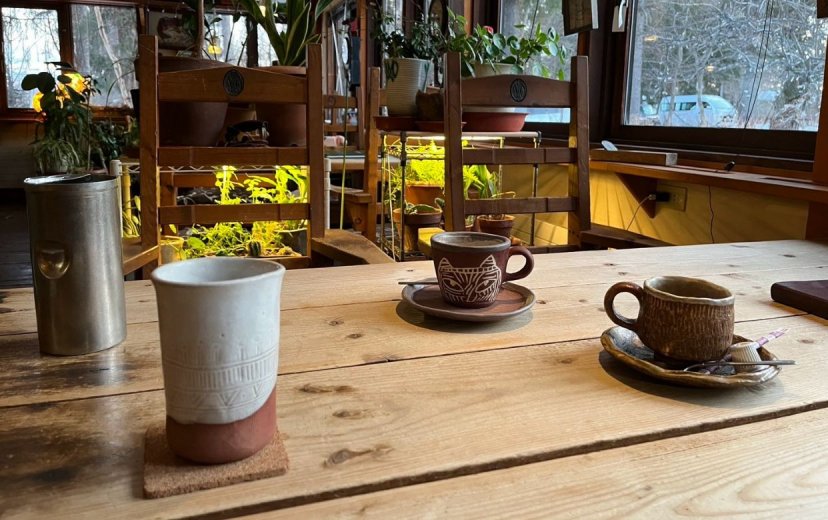 手作りの陶器の食器、椅子テーブルを使いながら、