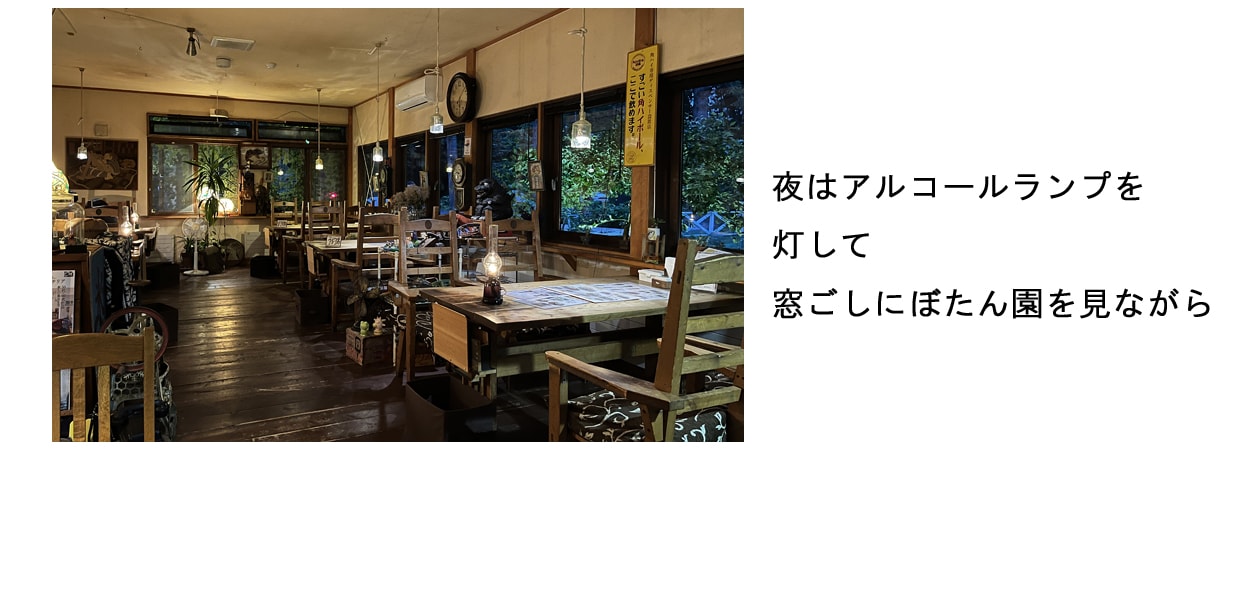昼はボタン園を借景に、夜はアルコールランプの炎の揺らぎの中で