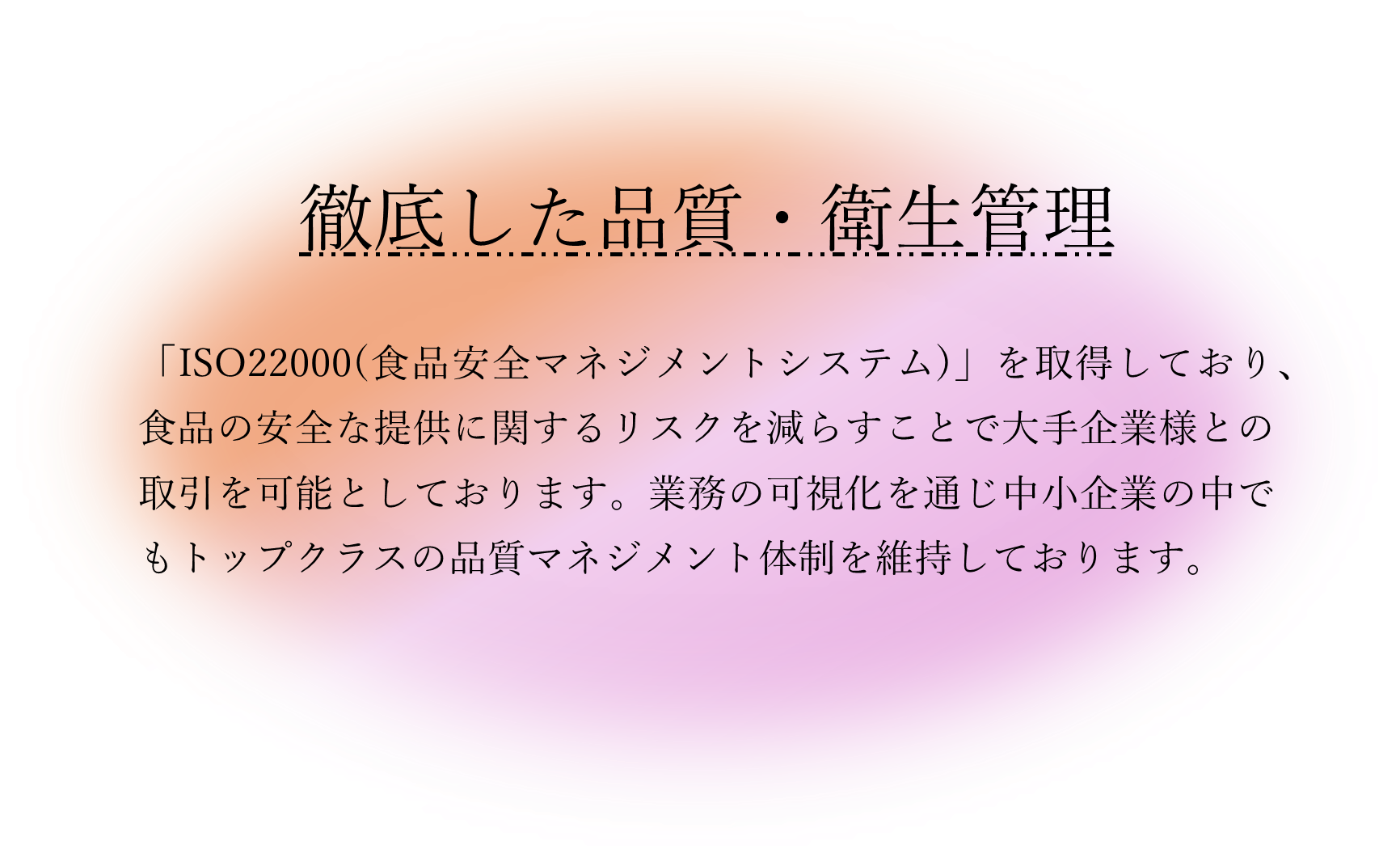 1.ISO22000に基づいた食品安全マネジメントシステムを構築、維持、継続的に改善を行い、