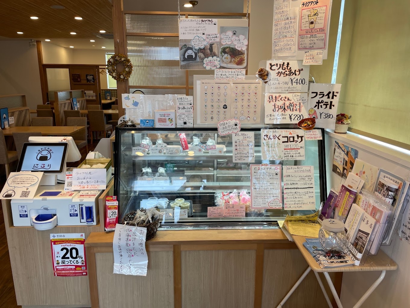 入り口入ってすぐにはテイクアウトのおむすびがショーケースに並び、テイクアウトもしやすいお店です。