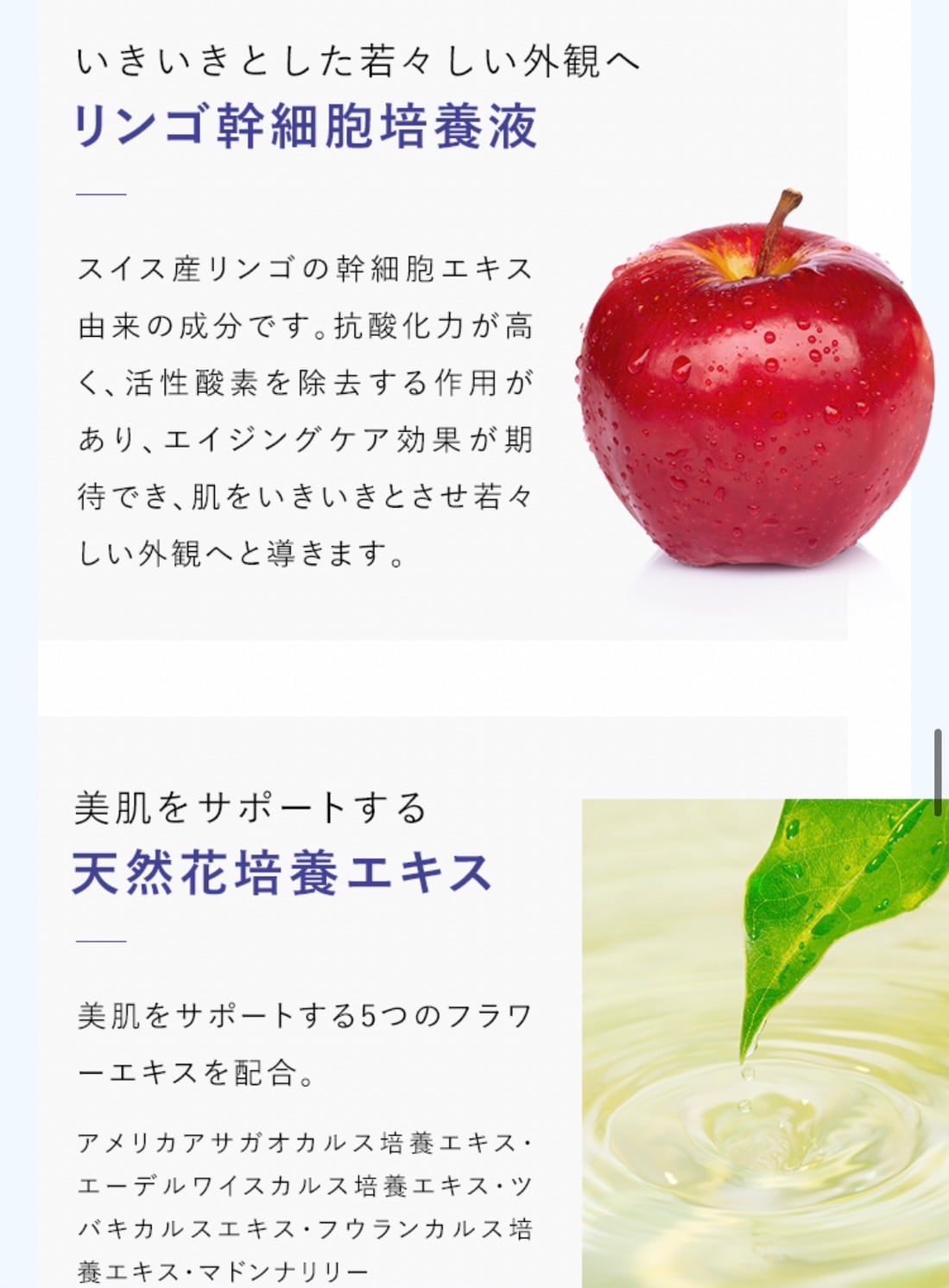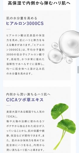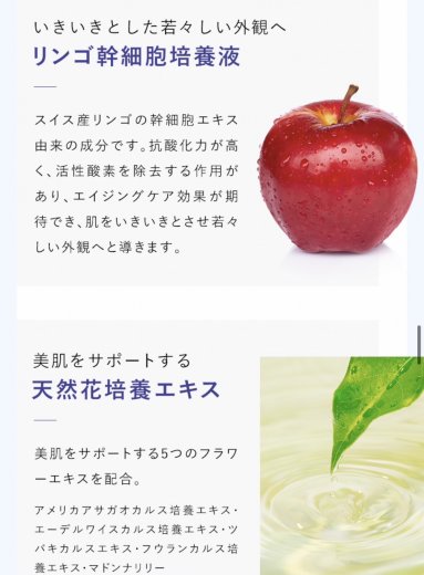 水、グリセリン、ヒト臍帯血細胞順化培養液、ヒアルロン酸Na、ツボクサエキス、リンゴ果実培養細胞エキス、アメリカアサガオカルス培養エキス、エーデルワイスカルス培養エキス、ツバキカルスエキス、フウランカルス培養エキス、マドンナリリーカルス培養エキス、キサンタンガム、フェノキシエタノール、BG、メチルパラベン