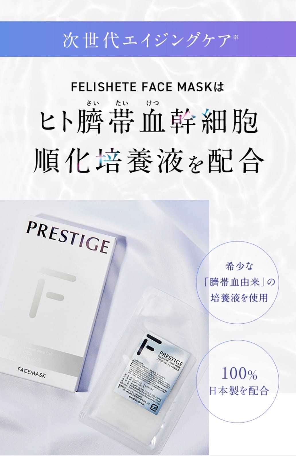 オイルフリー、ノンアルコール、無香料、ヒト臍帯血細胞順化培養液(整肌成分)、ヒアルロン酸Na(保湿成分)、CICA:ツボクサエキス(整肌成分) 配合の美容フェイスマスクです。