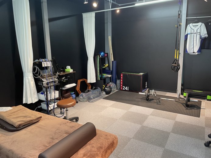 バッティングセンターの中に併設され店内は黒を基調としたまるで秘密基地のようなスポーツ特化型のBASE溝の口接骨院!!