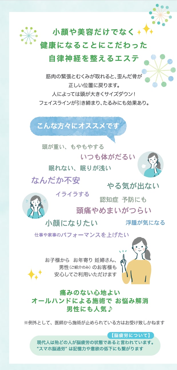 痛みのないやさしい施術で、深いリラックスと小顔効果が期待できる新感覚のリラクゼーションとして人気があります。