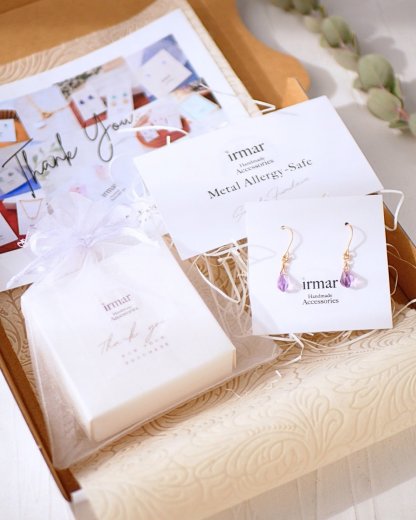 当店のアクセサリーは金属アレルギー対応の素材を私自身で着用テストをし、モニターテストもして、厳選した金属アレルギー対応のパーツ(14kgf、サージカルステンレス316L、ニッケルフリー )を使用しています。さらに金属アレルギー対策のコーティングもさせていただいておりますので安心して長時間つけていただくことが可能です。着けっぱなしでもかゆくなりにくいアクセサリーです。ギフトラッピングをご用意しておりますので、プレゼントとしてもおすすめです。