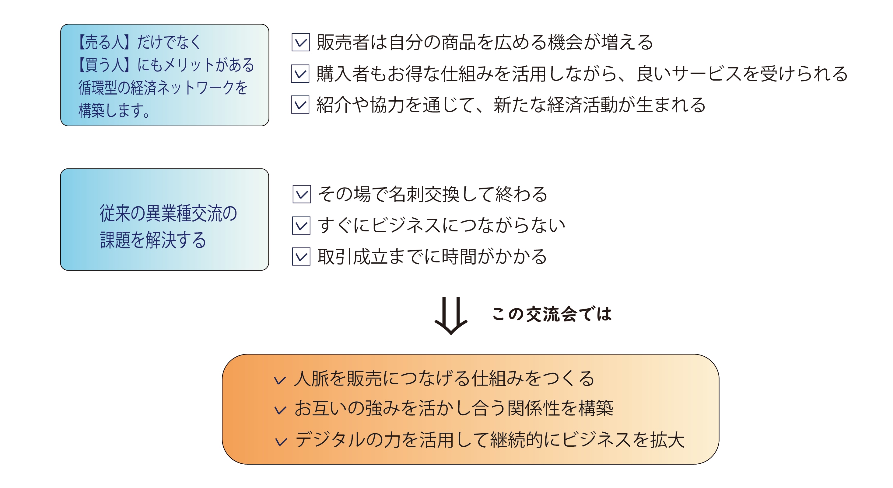 本会は、会員自主運営の基に会員相互の事業・人脈形成、情報交換、交流を図ることにより、会員企業の事業体質強化拡充を目指し、地域経済への貢献と会員企業の発展と共生を目的とする。