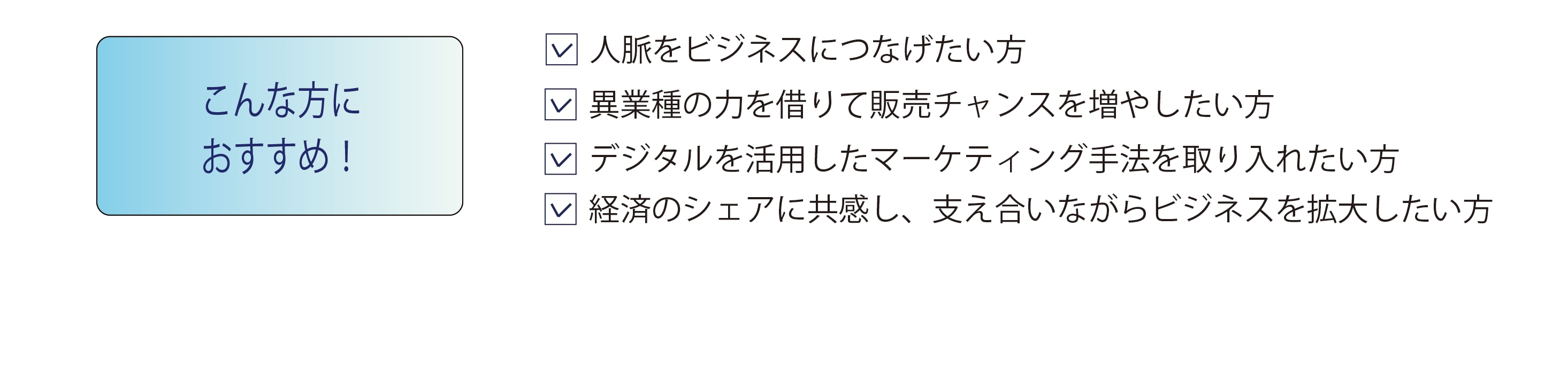 1. 会員間の良き人脈形成の場を提供し、研究会、情報交換、販売協力、支援、提携等のビジネスチャンスを拡げ、交流を図る場として月例会及びその他の集まりを開催する。
