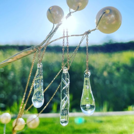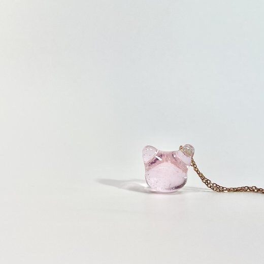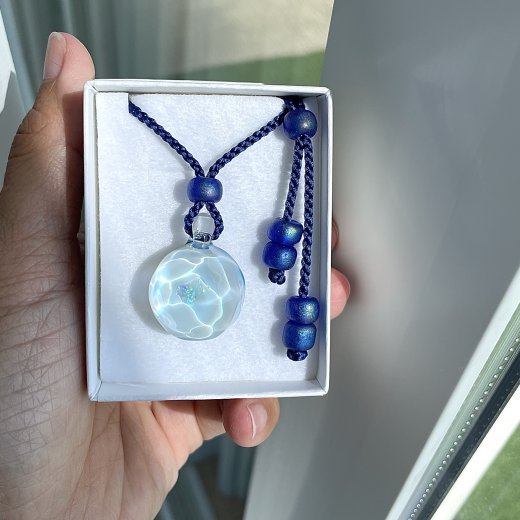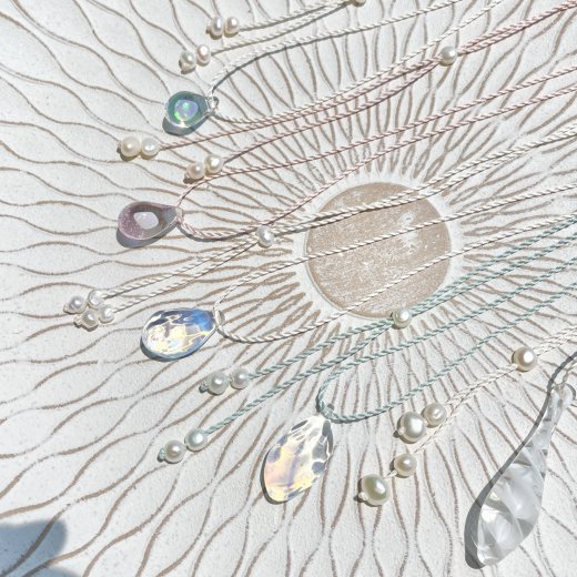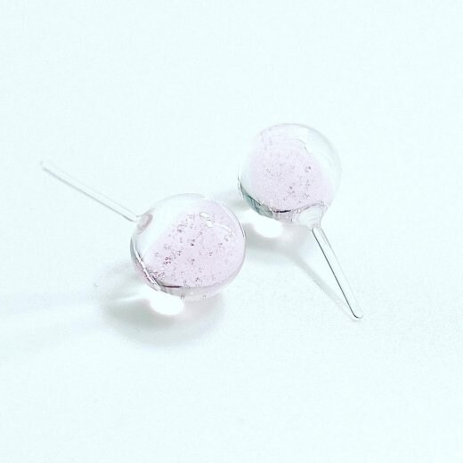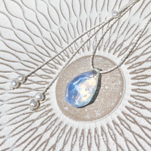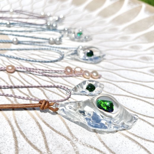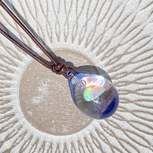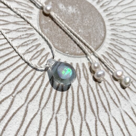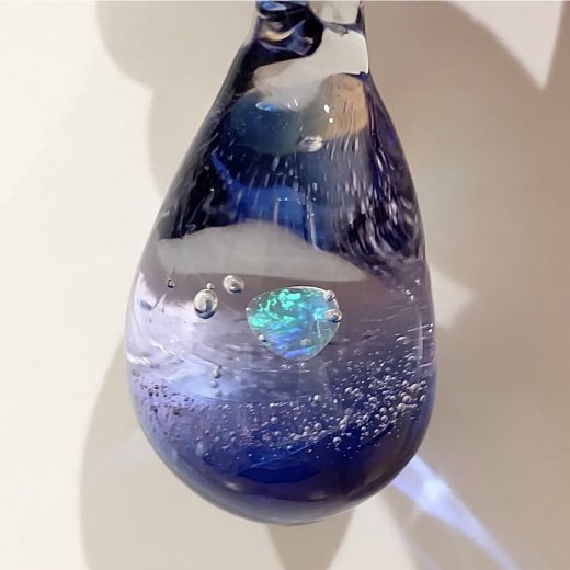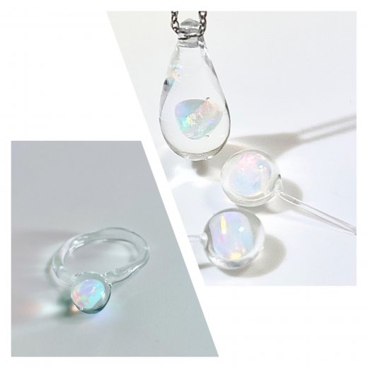 オパールを加工する際には、丁寧で繊細な火力調整と手作業が要求されます。耐熱性も兼ね備えたオパールを使用しておりますが、1200度以上の火に当てられると白く変色してしまいます。ガラスジュエリーに加工する前に、まず菅ガラスの中にオパールを入れ、管の外側から低温で少しずつ熱し、ガラスの中に時間をかけて閉じ込めていく必要があります。この丁寧な作業を経てガラスに閉じ込められたオパールの輝きは、より一層美しく心奪われる作品となります。