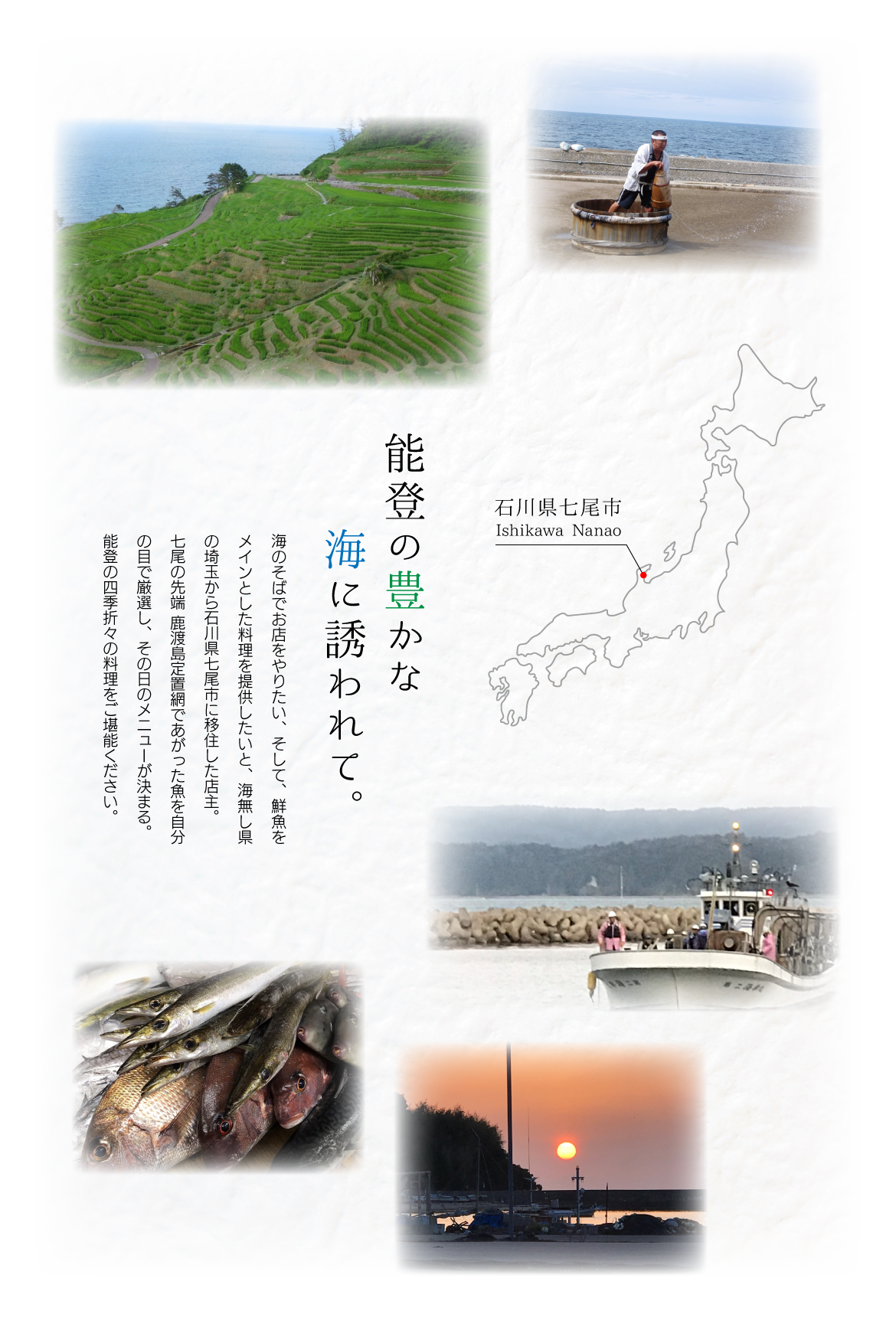 牡蠣餃子で大人気のお店です。店主は埼玉県越谷市出身で、越谷市の寿司割烹浜丁寿司で10年間修行し、その後も創作鉄板焼き料理のお店やオリジナル料理のお店、そしてのどぐろ専門のお店等で働いていました。そんな中、海のそばで自分のお店をやりたいと考えるようになり、半年間1人で車で日本中を移動し、山形県の遊佐町からスタートし、石川県能登町、七尾市、京都府伊根町、島根県大田市、山口県長門市、高知県四万十市と探し回りました。石川県七尾市で開店後は、埼玉の色々なお店で経験したことを、日々自分のオリジナル料理や、素材をシンプルに活かした料理を作っております。牡蠣餃子はお取り寄せとしても最適です。