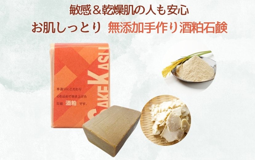 酒粕、米ぬかを使った石鹸 無添加にこだわり続け心を込めて手作りしました。酒粕米ぬかにはリノール酸やビタミン類が豊富に含まれています。洗うたびに肌が白くつるつるに!敏感肌 美白 肌のハリ 保湿 石けん