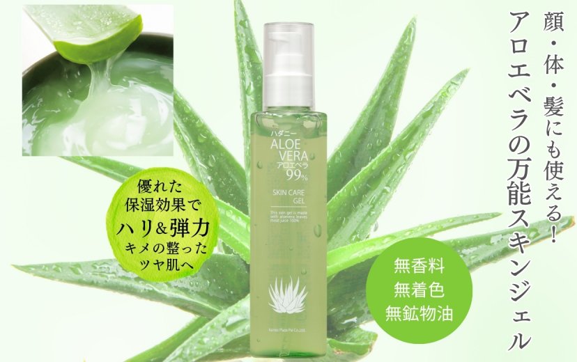水を一切使わずにアロエベラの葉肉から低温抽出したアロエベラ液汁を限度の99%まで使用。高い保湿力は皮膚にうるおいを与え肌荒れを防ぎ柔らかい肌に保ちます。乾燥、日焼け、髭剃り後、しもやけ、虫刺されにも!