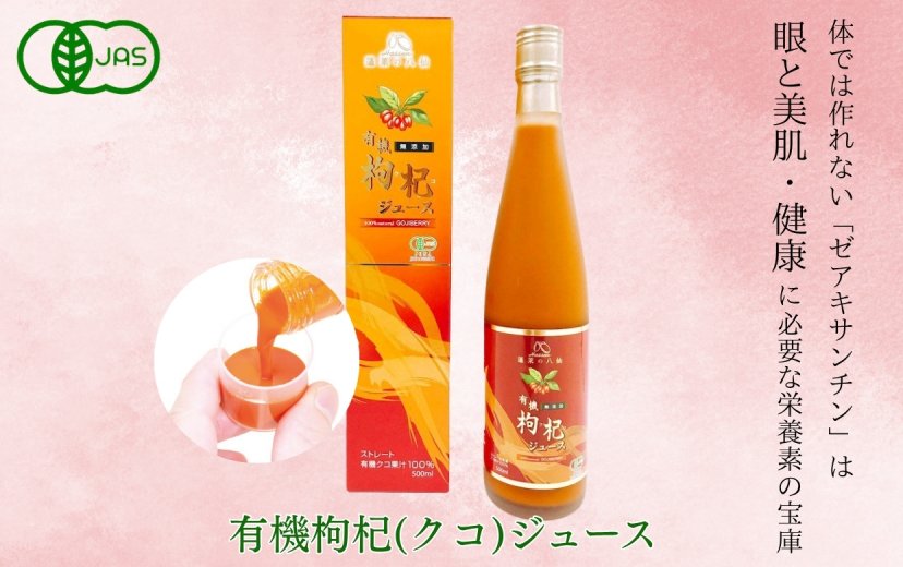 有機枸杞ジュース 必須アミノ酸やビタミンを豊富に含んでおり、血行を良くする「ベタイン」やルテインゼアキサンチン、ミネラルなど豊富に含んでいます。抗酸化力/美肌/目の健康/飲む日焼け止め/クコの実