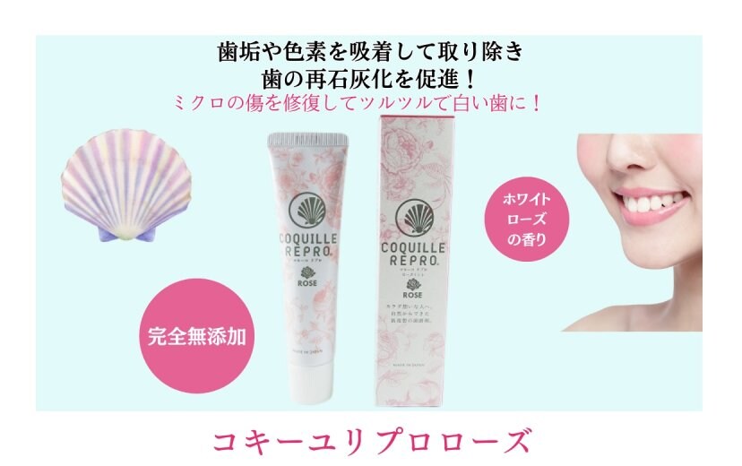 コキーユリプロローズ 天然ホタテ貝由来のバイオアパタイトが歯の美白と健康をもたらします。完全無添加!研磨剤、発泡剤、増粘剤も不使用。歯を白くする 歯周病の予防 口臭防止