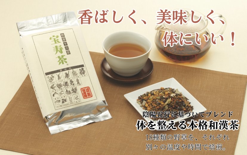 18種類の野草をそれぞれ別の温度や時間で焙煎 体を整える本格和漢茶 宝寿茶 ハブ草 ハトムギ プーアール ドクダミ ヨモギ クコ葉 オオバコ シソ グァバ葉