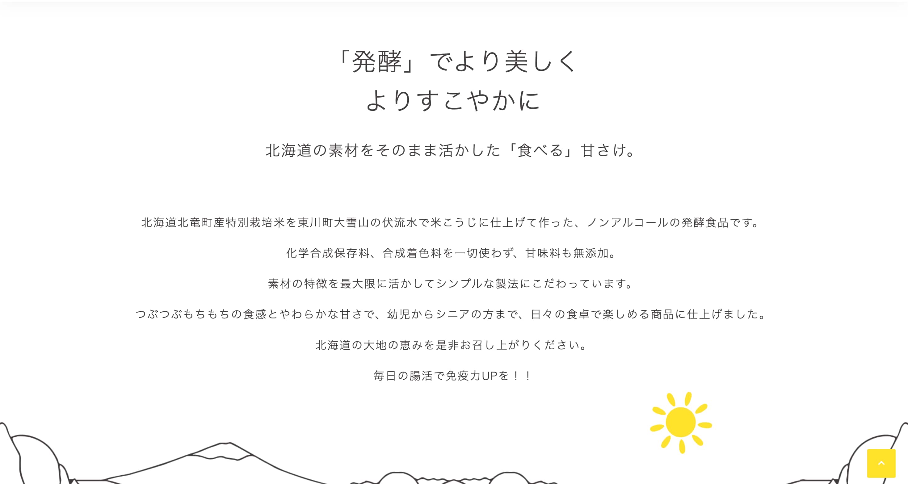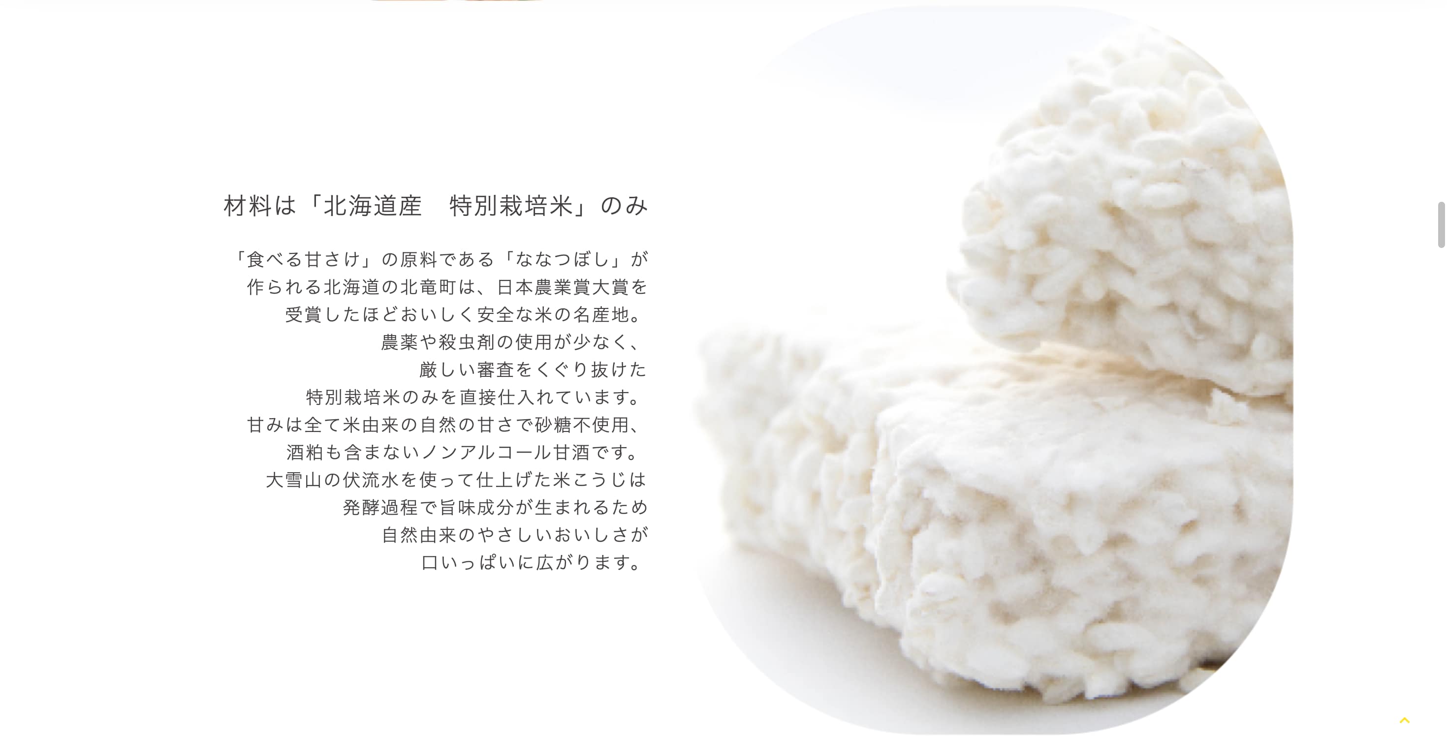 甘みは全て米由来の自然の甘さで砂糖不使用、酒粕も含まないノンアルコール甘酒です。大雪山の伏流水を使って仕上げた米こうじは発酵過程で旨味成分が生まれるため自然由来のやさしいおいしさが口いっぱいに広がります。