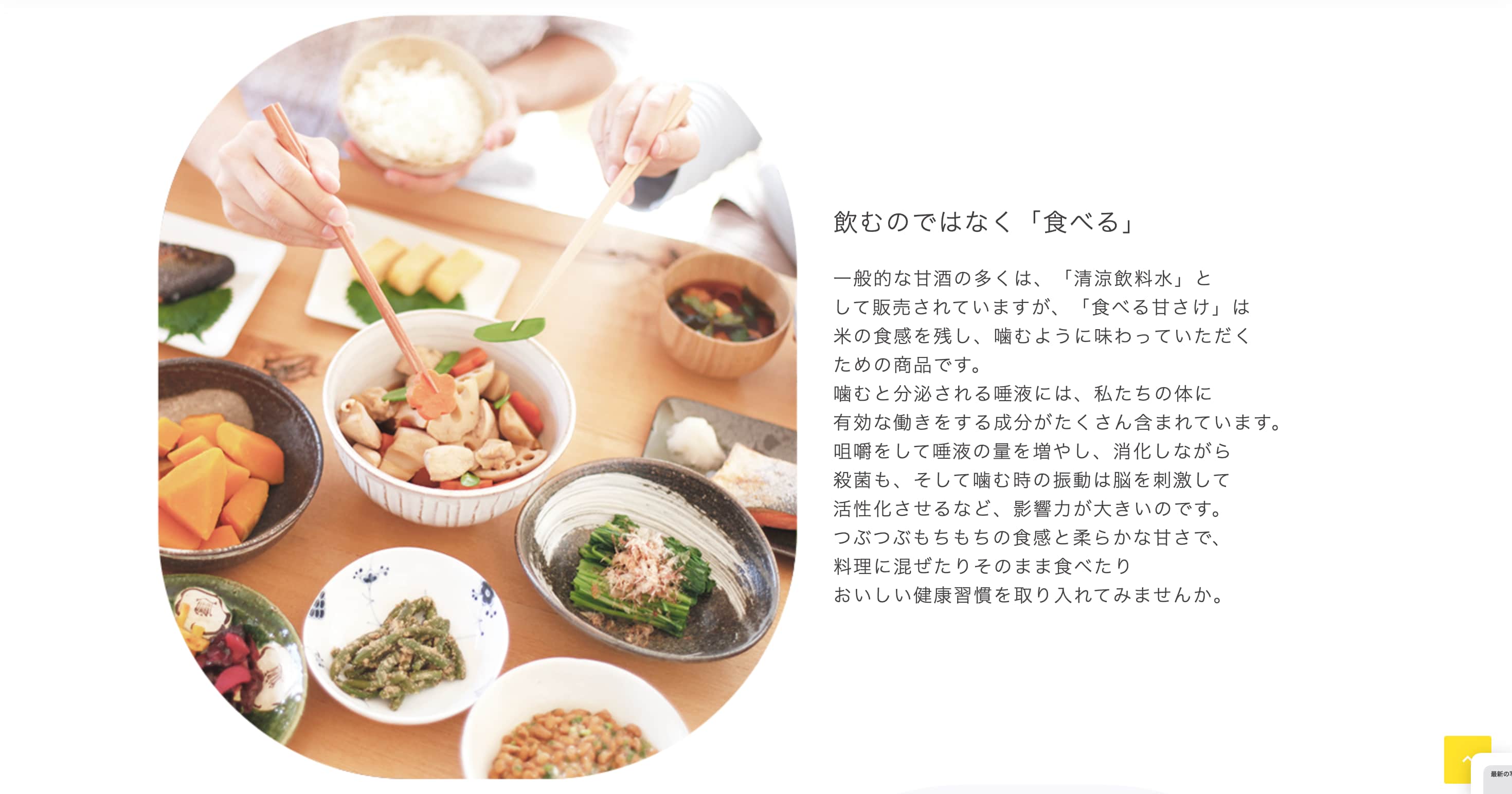 一般的な甘酒の多くは、「清涼飲料水」として販売されていますが、「食べる甘さけ」は米の食感を残し、噛むように味わっていただくための商品です。噛むと分泌される唾液には、私たちの体に有効な働きをする成分がたくさん含まれています。