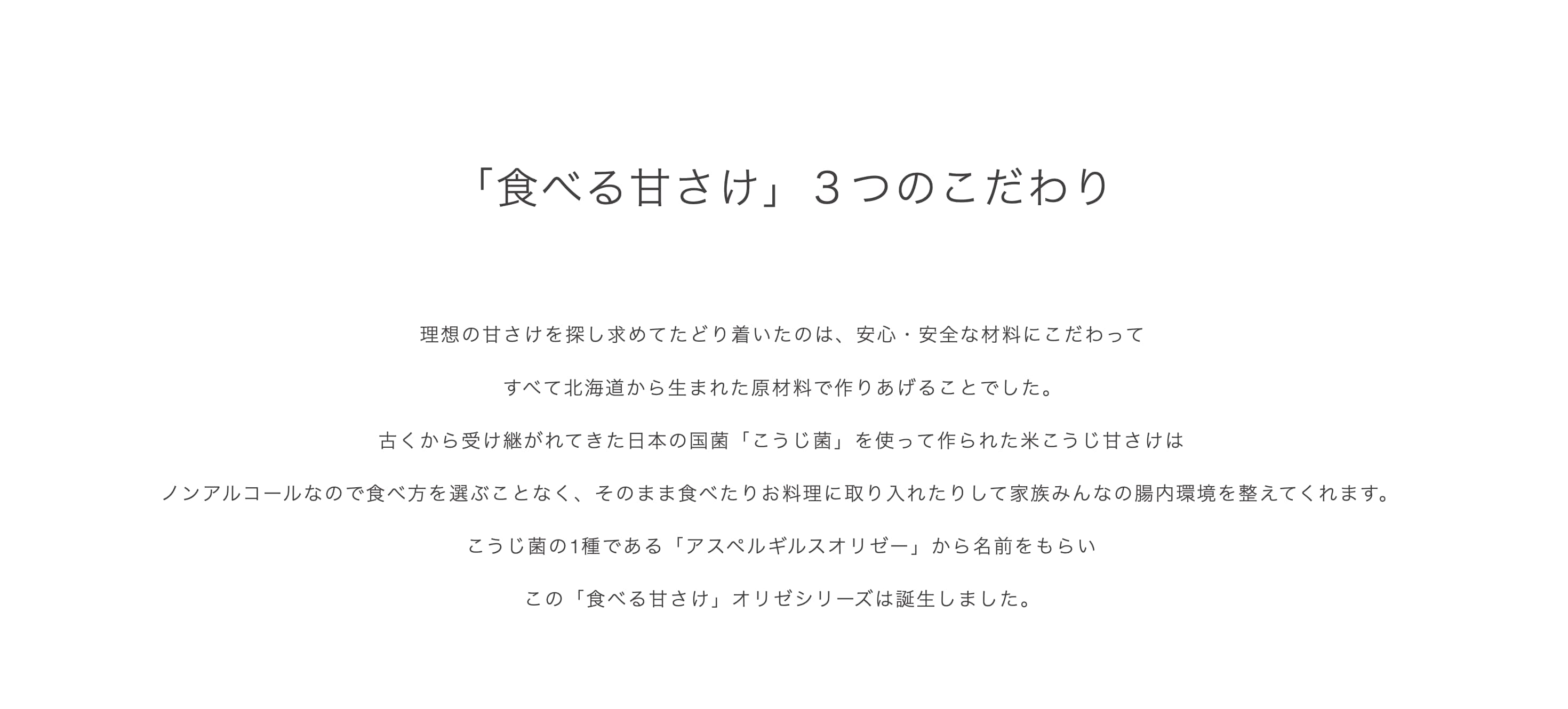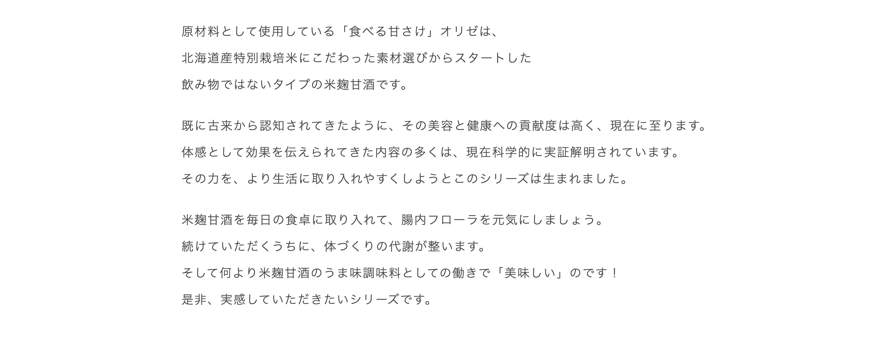こうじ菌の1種である「アスペルギルスオリゼー」から名前をもらいこの「食べる甘さけ」オリゼシリーズは誕生しました。
