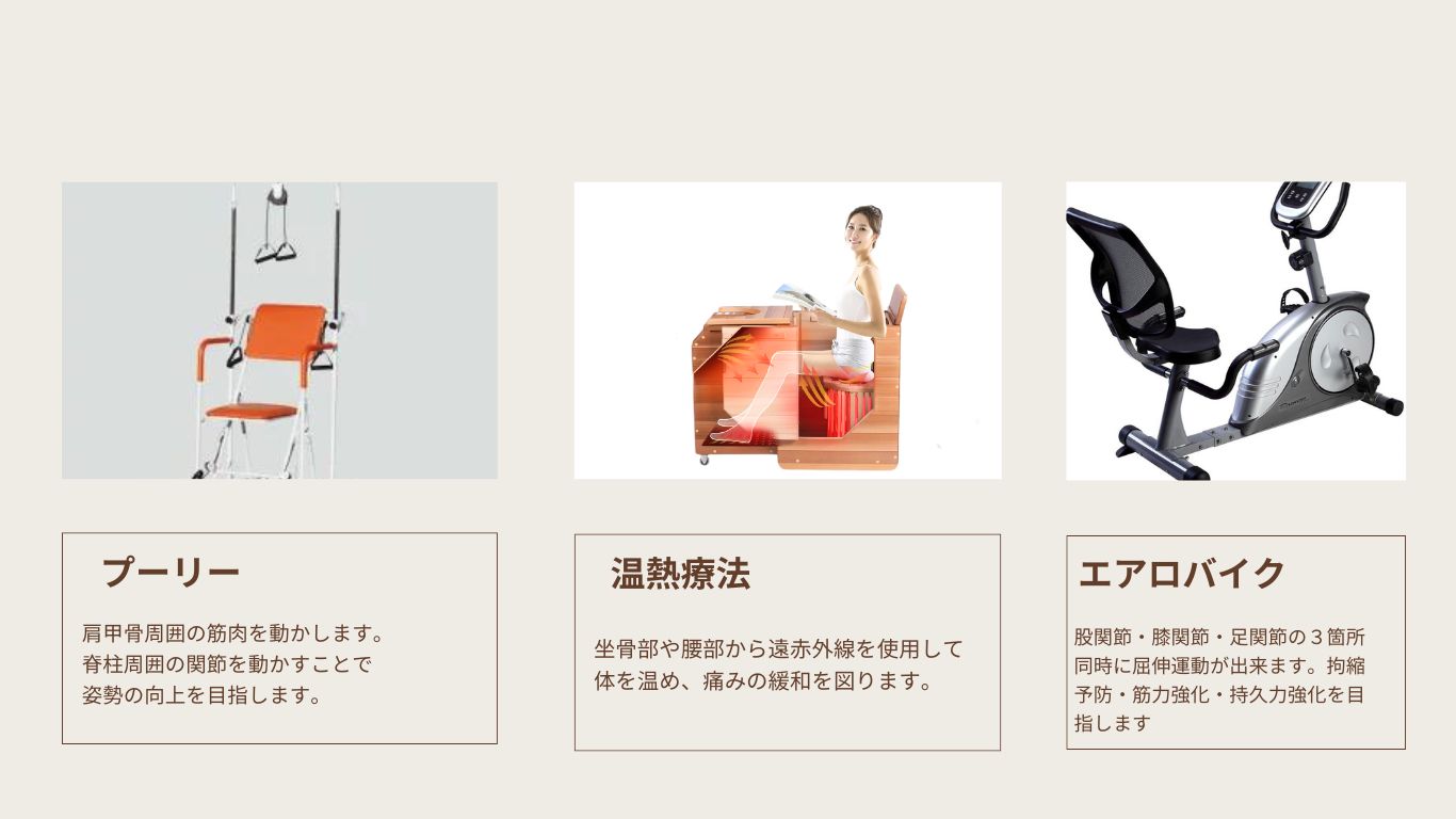 『理学療法士による個別リハビリ』と『癒しのアロマケア』を中心に運動メニューも加えました。
