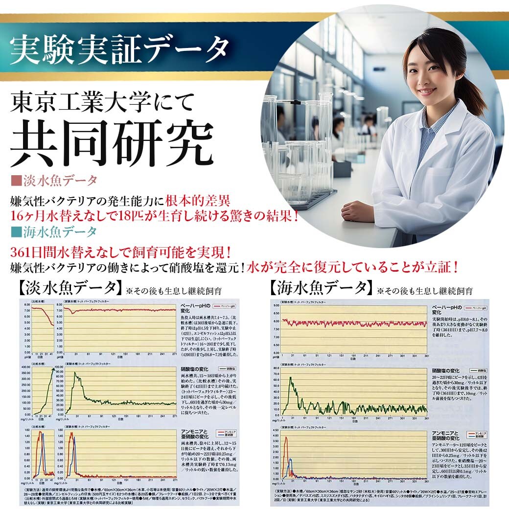 東京工業大学との共同研究によって開発され、アンモニア、亜硝酸塩、硝酸塩といった有害物質を効率よく除去することで、魚たちが健康的に育つ最適な環境を提供します。