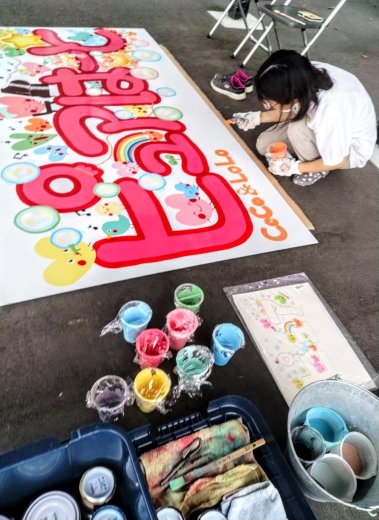 最近ではNPO法人さんの看板ペイントや小学校で卒業生との黒板チョークアート、保育園でのお絵描き、デイサービスでおじいちゃんおばあちゃんとの看板作りなど絵を描くことで自分を好きに表現する楽しさやワクワクする気持ち、HAPPYを届ける活動を幅広くさせていただいています。