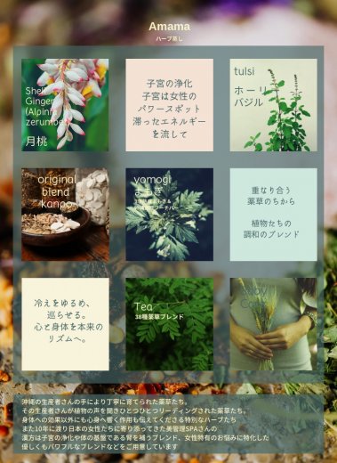 600年前に韓国で生まれた民間療法の「よもぎ蒸し」。よもぎや薬草を煮立たせた蒸気を、粘膜にダイレクトに吸収する「薬草蒸気浴」で体を温める施術です。Amama のハーブ蒸しは無農薬栽培のハーブ、薬草を中心に心地よい温かさでゆっくりあたため深部体温をあげ体内の巡りをサポート。植物のもつ“薬効成分”と“香り“を皮膚や粘膜からたっぷり吸収することで体調改善へ導いてくれます。