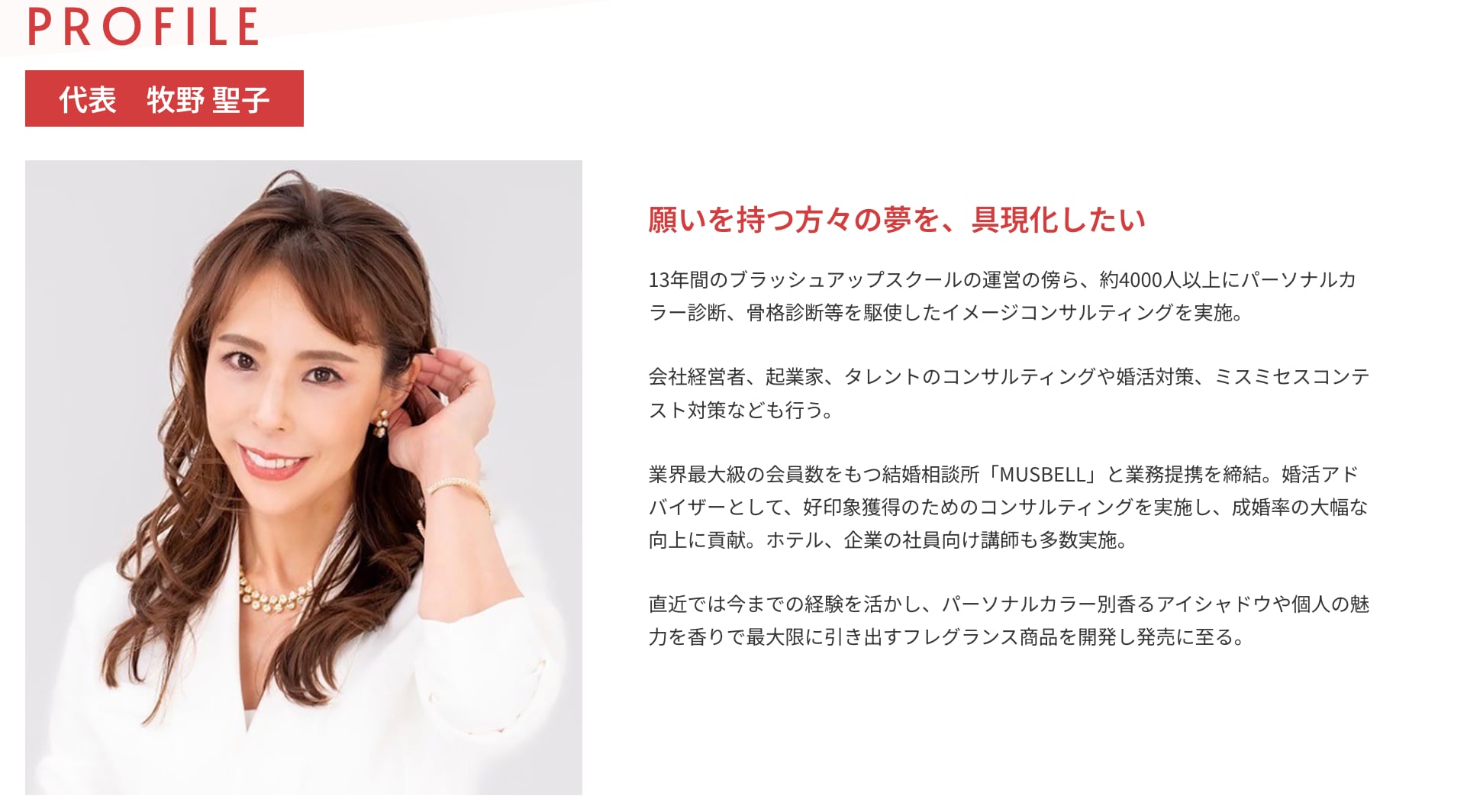 業界最大級の会員数をもつ結婚相談所「MUSBELL」と業務提携を締結。婚活アドバイザーとして、好印象獲得のためのコンサルティングを実施し、成婚率の大幅な向上に貢献。ホテル、企業の社員向け講師も多数実施。