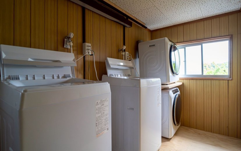 1階寝室・1部屋10畳×3部屋に布団を各2人分敷けます。合計6名のご用意が可能です。キッチンはもちろん、食器、冷蔵庫、電子レンジに電気ケトル、洗濯機、乾燥機もあるので長期滞在にも適しています。ドライヤーも完備し、タオル類もご提供しているのでご安心ください。