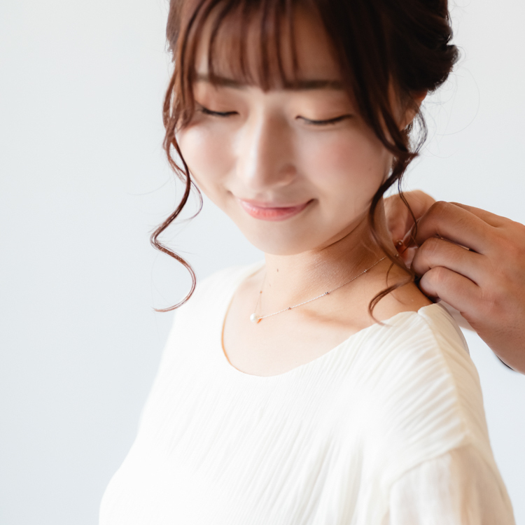 ひと粒パールのネックレスは、連のパールネックレスとは違い、「その一粒が全て」ですので、テリ・マキ(真珠層)・色・カタチ(真円)が厳選された上質な真珠が使われたものを選ぶことが大切です。 特にテリ・マキから生まれる表面光沢と干渉色のハーモニーがとても大切で、それが弱いと安っぽさが際立ってしまいます。 真珠には、いくつかの種類がありますが、小さくてひと粒でも美しい存在感を放つ「アコヤ真珠」はプレゼントにぴったりです。