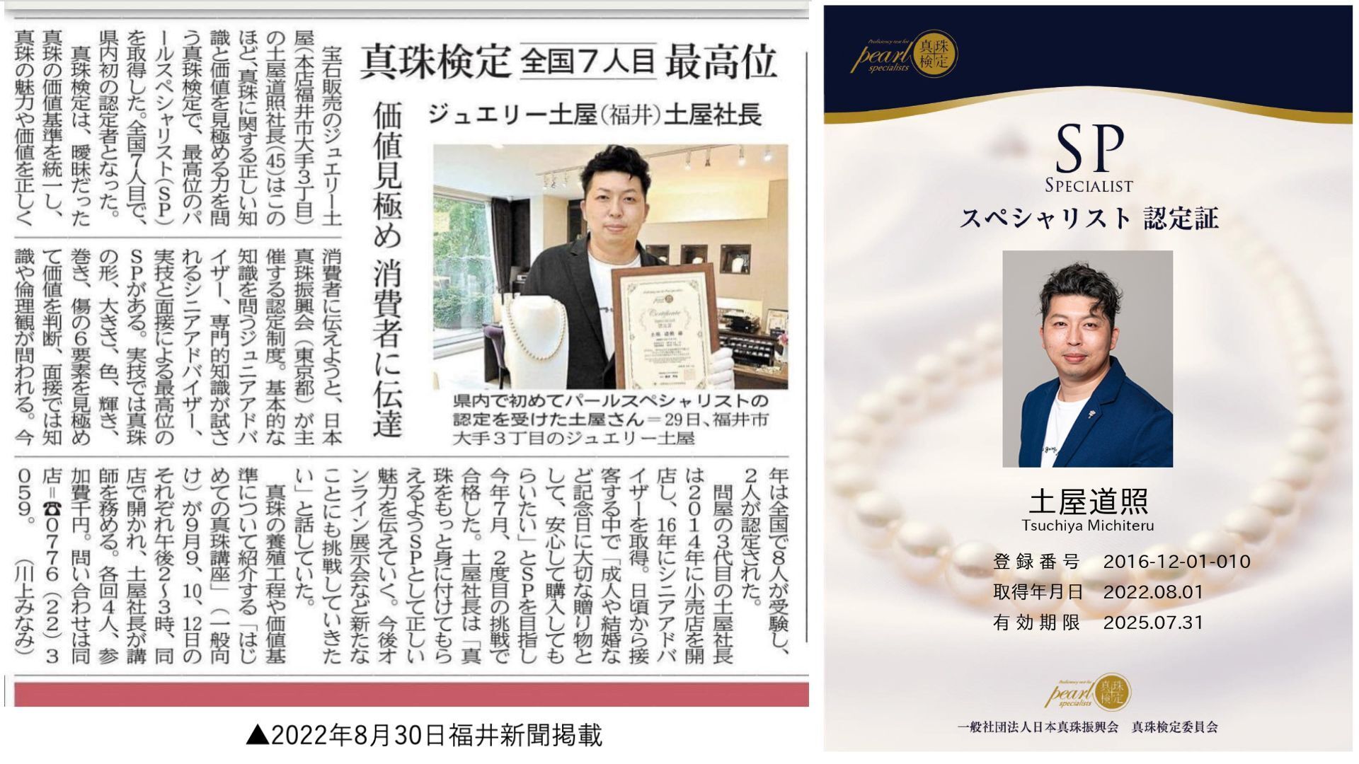 福井県では初、日本全国でもわずか8人しか存在しないこの資格(※取得当時)は、私たちが扱う真珠が「今の時代に合わせた最先端の知識と経験」によって選ばれたものである証です。