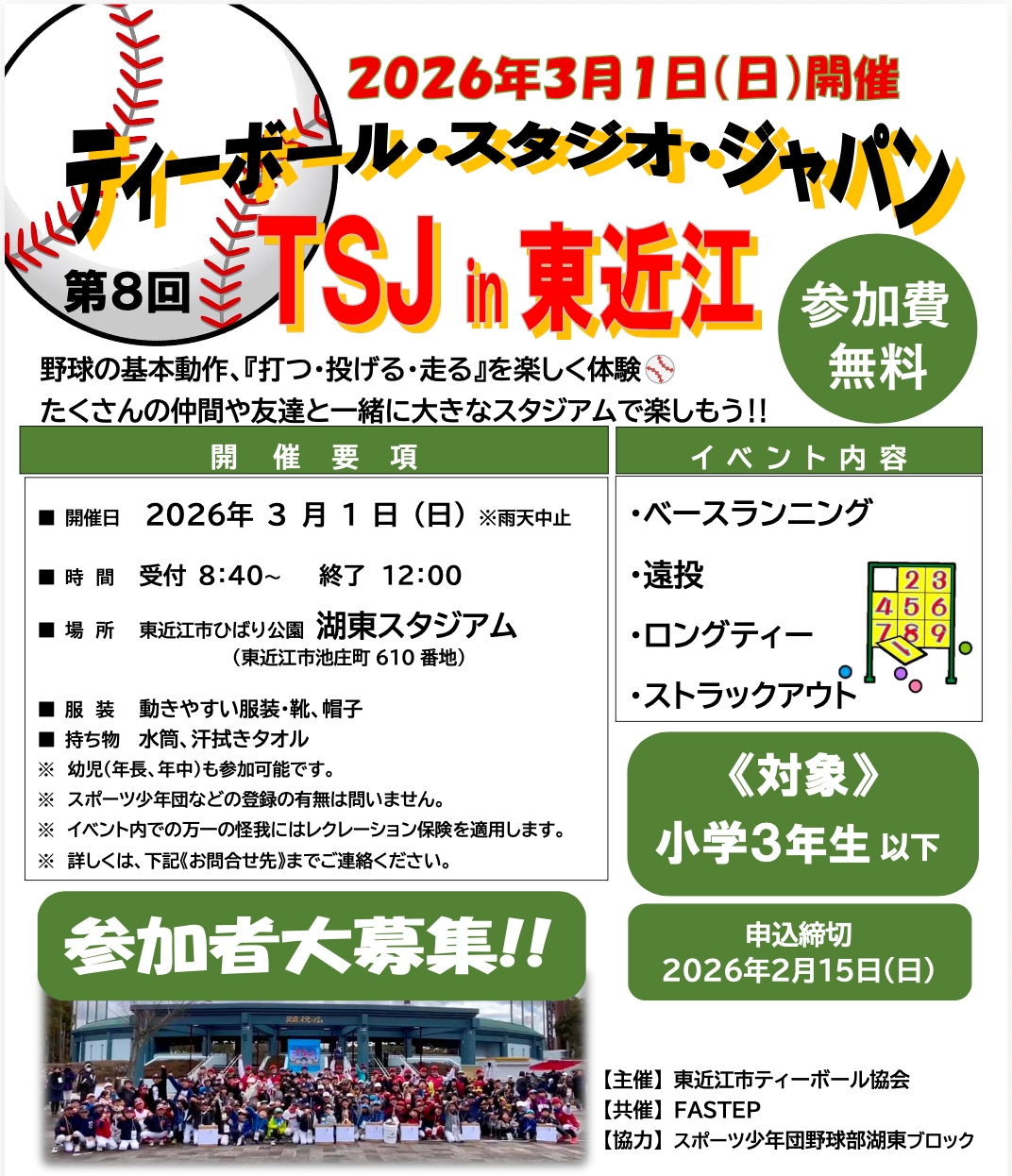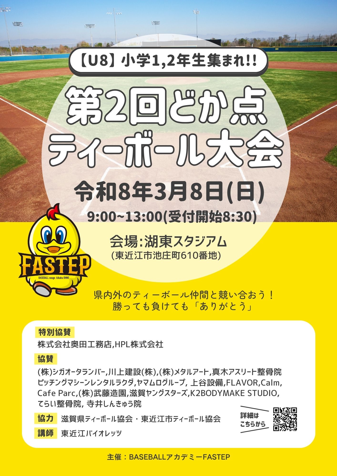 滋賀キッズ向けベースボールアカデミーFASTEP《ファステップ》は令和4年4月本校開校より 未就学児(4才)〜小学6年生(12才)までのお子様たちを対象に、 野球を通じて「運動の楽しさ・基礎の大切さ」を伝えるスポーツアカデミーです。運動神経が伸びやすい「ゴールデンエイジ」の時期にファステップで更なる能力向上をお手伝いします。
