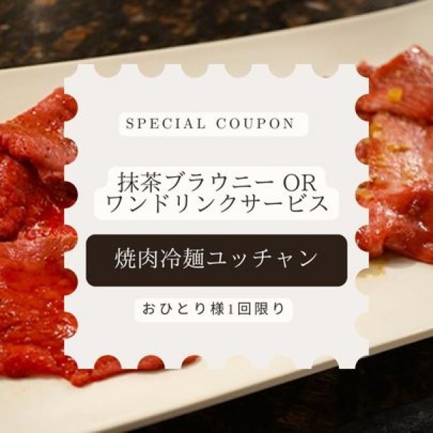 ●焼肉冷麺ユッチャン 抹茶ブラウニーorワンドリンクサービスクーポン 【クーポン内容】 抹茶ブラウニー...