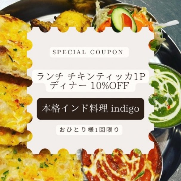 indigo ランチ チキンティッカ1P/ディナー 10%off クーポン