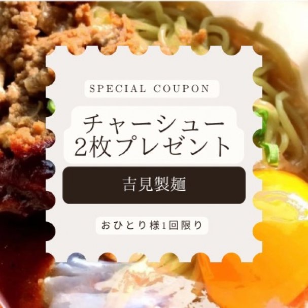 ● 吉見製麺 チャーシュー2枚プレゼントクーポン 【クーポン内容】 チャーシュー2枚プレゼントクーポン ...