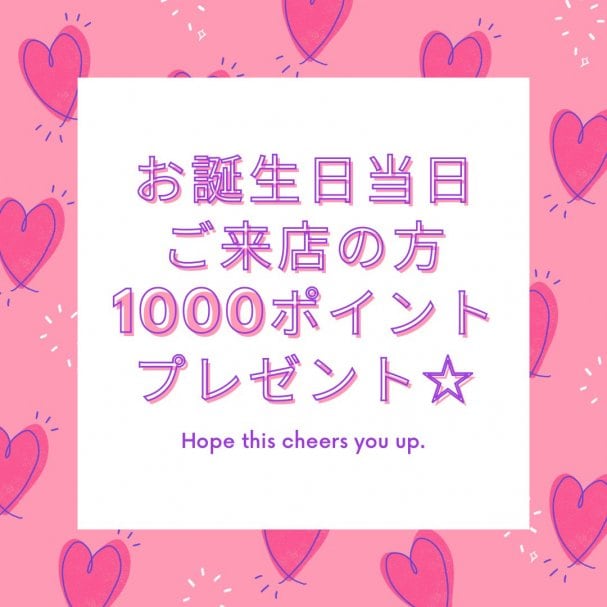お誕生日当日にご来店の方は1000ポイントプレゼントいたします! お誕生日月にご来店で10分延長サービス...